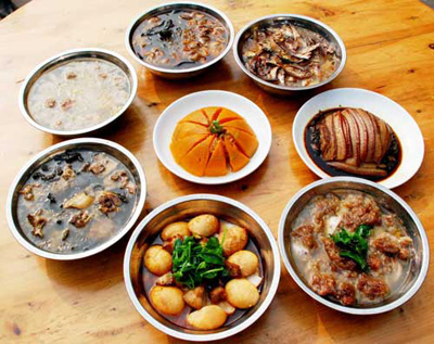 如果說靖港的吃名聞遐邇,有口皆碑,那么,八大碗則是靖港吃之翹楚,也是古鎮人引以為榮的傳統名牌。從前靖港街上數十家有名餐館,都把八大碗當作各自的招牌菜,各餐館的廚師也都是潛心研習,精益求精,把烹制出高水平的八大碗當作看家本領。曾經繁榮昌盛的“小漢口”靖港,那些停船上岸的船夫,載貨而來的生意人以及慕名而來的浪人,首先就得進餐館吃八大碗,飽其饞吻,享其口福,乃至為了貪吃八大碗而“船到靖港口,順風也不走。”而靖港街上的紅白喜事,也是非八大碗不成宴席。
