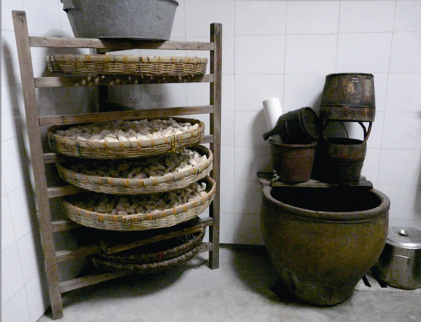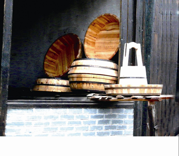 二、發酵,粉團中合進“老粉”,以釀帶釀。天熱時,置于案板上,蓋薄布片,使其自動發酵;天泠時,用熱水或火烤,促其發酵。待粉團溢出一股芬香,方為發酵成功。