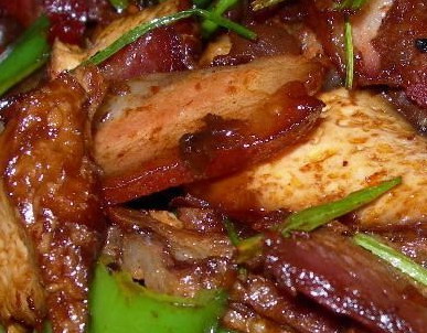 香干燜回鍋肉:把半瘦半肥的豬肉煮熟煮爛,冷卻后切成塊,香干也切塊,一同放入缽中,加水,放干紅辣椒、蒜粒、鹽、醬油,蓋蓋。文火慢煨至熟。因肉的鮮味在慢煨中滲入香干,使香干中帶了肉的鮮味、肉中又帶了香干之香,其味收雙玉合壁之效。它也是古鎮人百吃不厭的一道家常菜。
