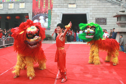 有布獅和毛獅兩種,舞時又分文獅和武獅。文獅刻畫獅子溫馴神態,動作詼諧細膩;武獅顯獅子勇猛,動作幅度強。舞獅的套子有“藤纏樹”、“烏云蓋雪”、“牛戀凼”、“泥鰍彈鍋”、“麒麟送子”等。用打擊樂和吹奏樂伴奏、氣氛熱烈莊重。舞獅時還有贊獅者伴唱,唱詞內容有反映勞動生活、祝賀吉祥、介紹傳說故事等,舞獅者隨唱詞內容和節奏進行表演。