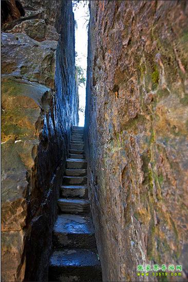 要繼續前進的路,悄然間已不那么分明,鉆洞繞石,似路非路,幾米外便難見人,百余米的路,艱難曲折,人需要彎腰才能上行。第二道鬼門關“誰能不低頭”便擋道于此。近百米的陡坡幾近直立,石路從兩塊巨石間穿過,人須側身才能慢慢上行,一夫當關,萬夫莫開。“一夫關”是第三道鬼門關。烏龍寨能立足多年,并非徒有虛名。