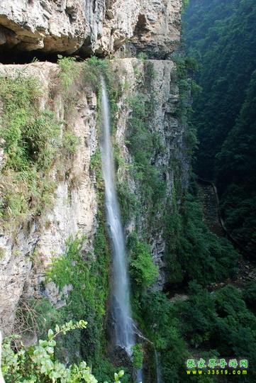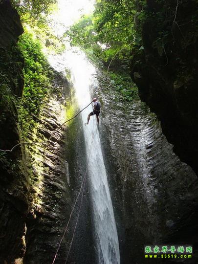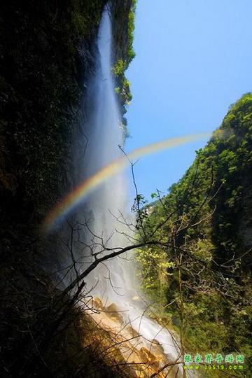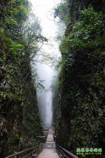 【神泉峽】有請各位朋友注意,我們行走到這里,您會發現,峽谷在這一段猛然一下子收縮了,變得越來越窄了。這段很窄的峽谷叫做神泉峽,總長300余米。在神泉峽,我們要穿過兩處水簾瀑,請大家保護好自己的攝像機、照相機等貴重物品,以免打濕受損。同時還要注意腳下,慢慢行走,因為這一段的木板棧道很滑。